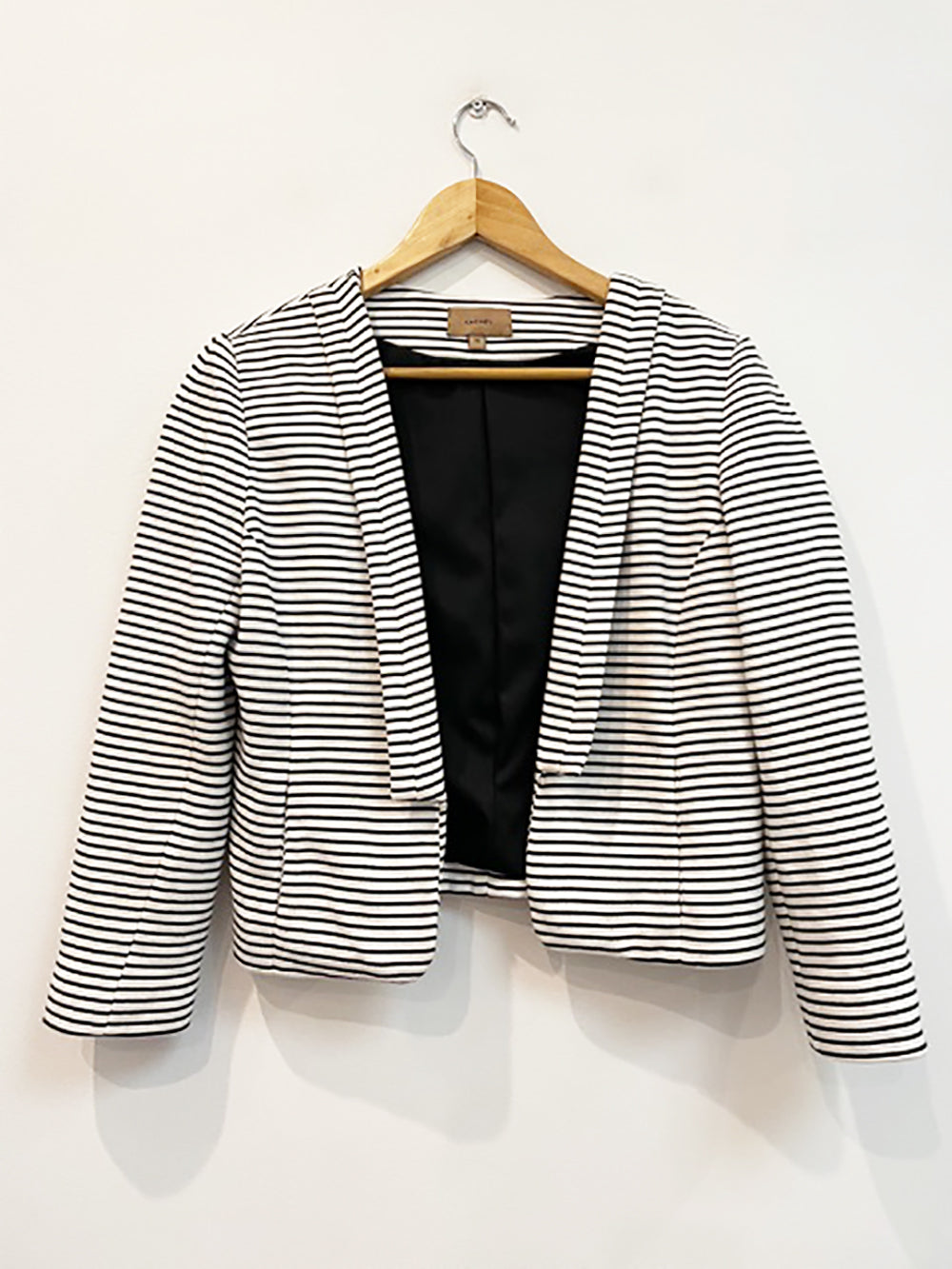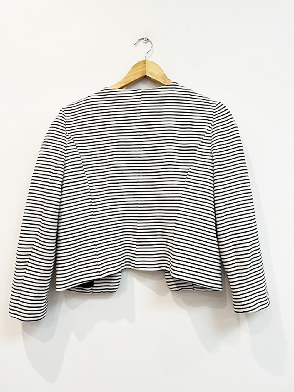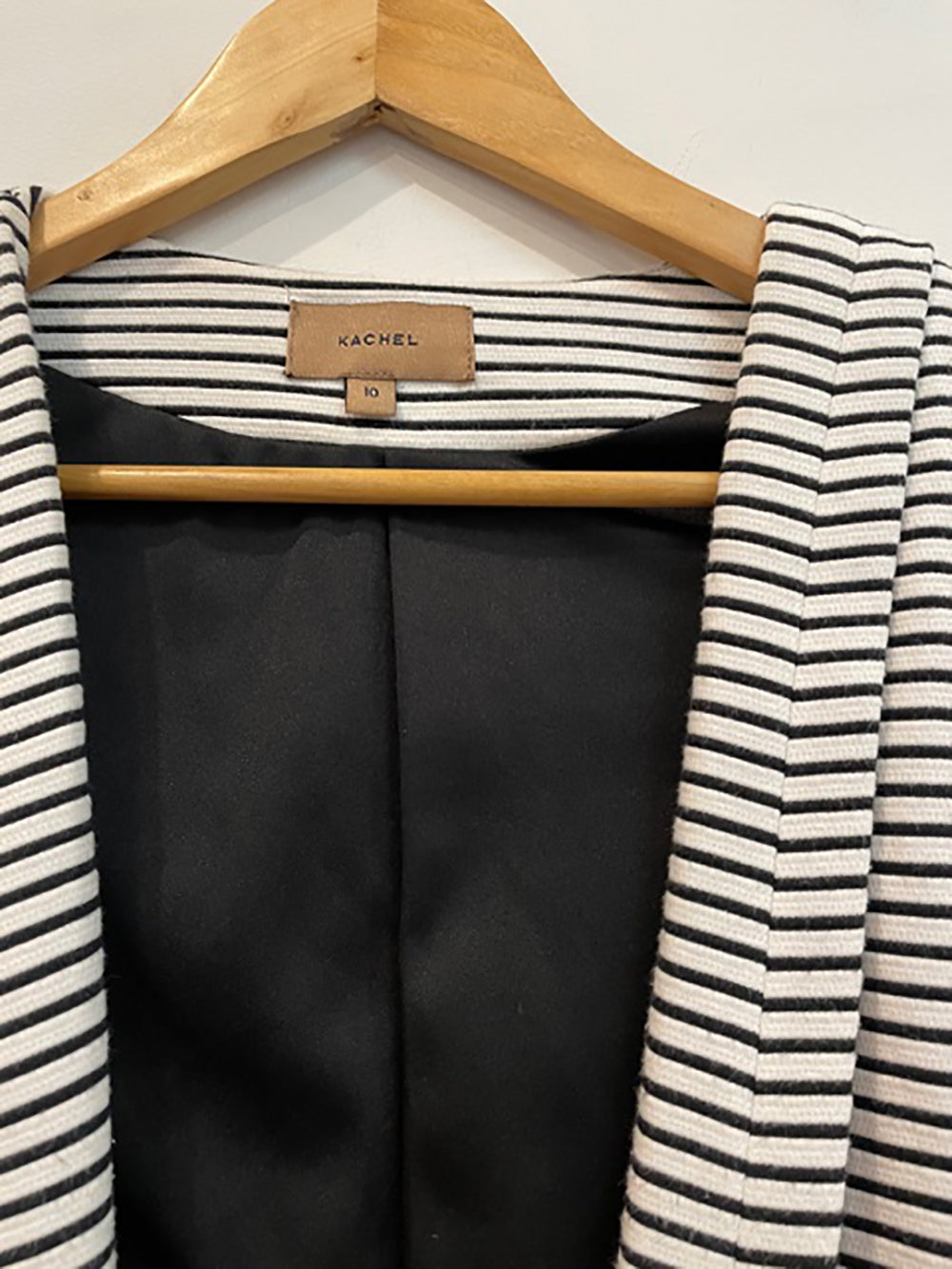 A chic stripe jacket from high street label Kachel! Black & white stripe with hook front fastening. Full length sleeves and fully lined! Small shoulder pads. PERFECT CONDITION!