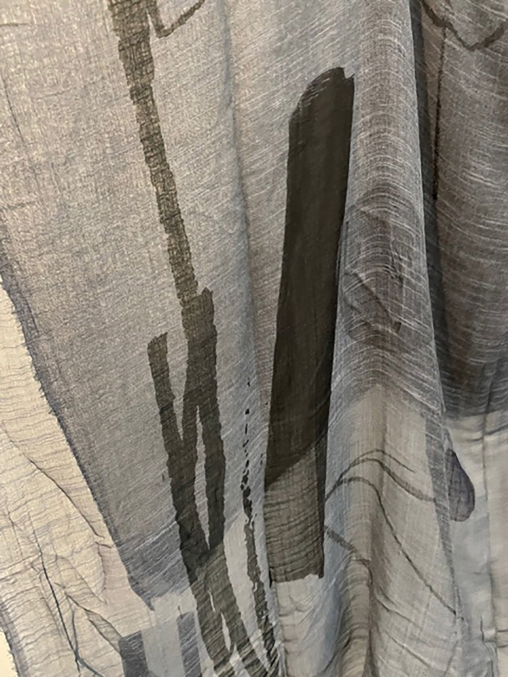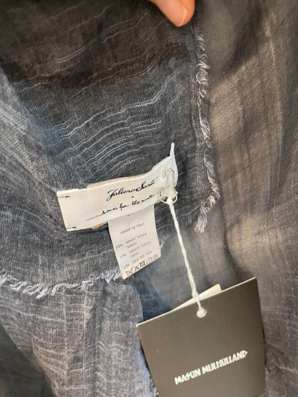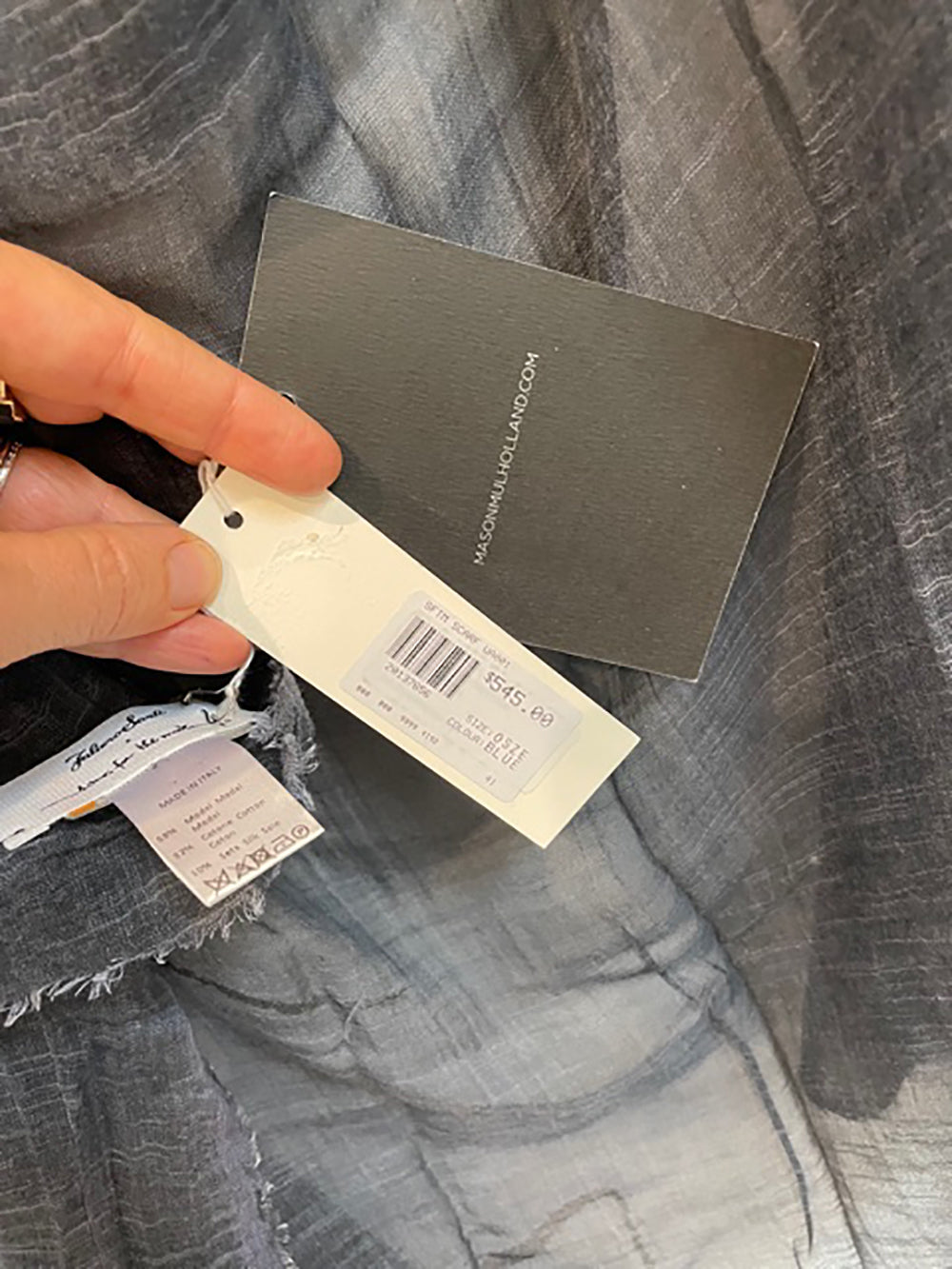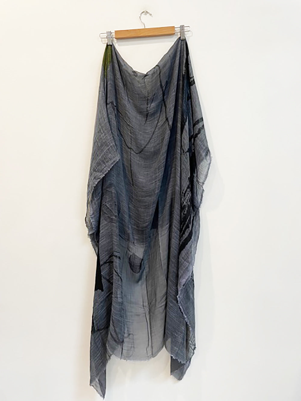 A super large rectangle scarf and a fine cotton, modal & silk blend. Lovely grey blue with cool geometric shapes all over. This is brand new with original tags.