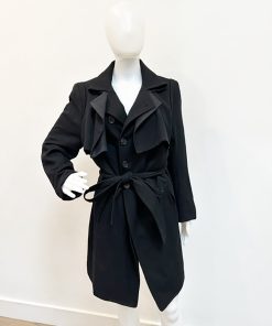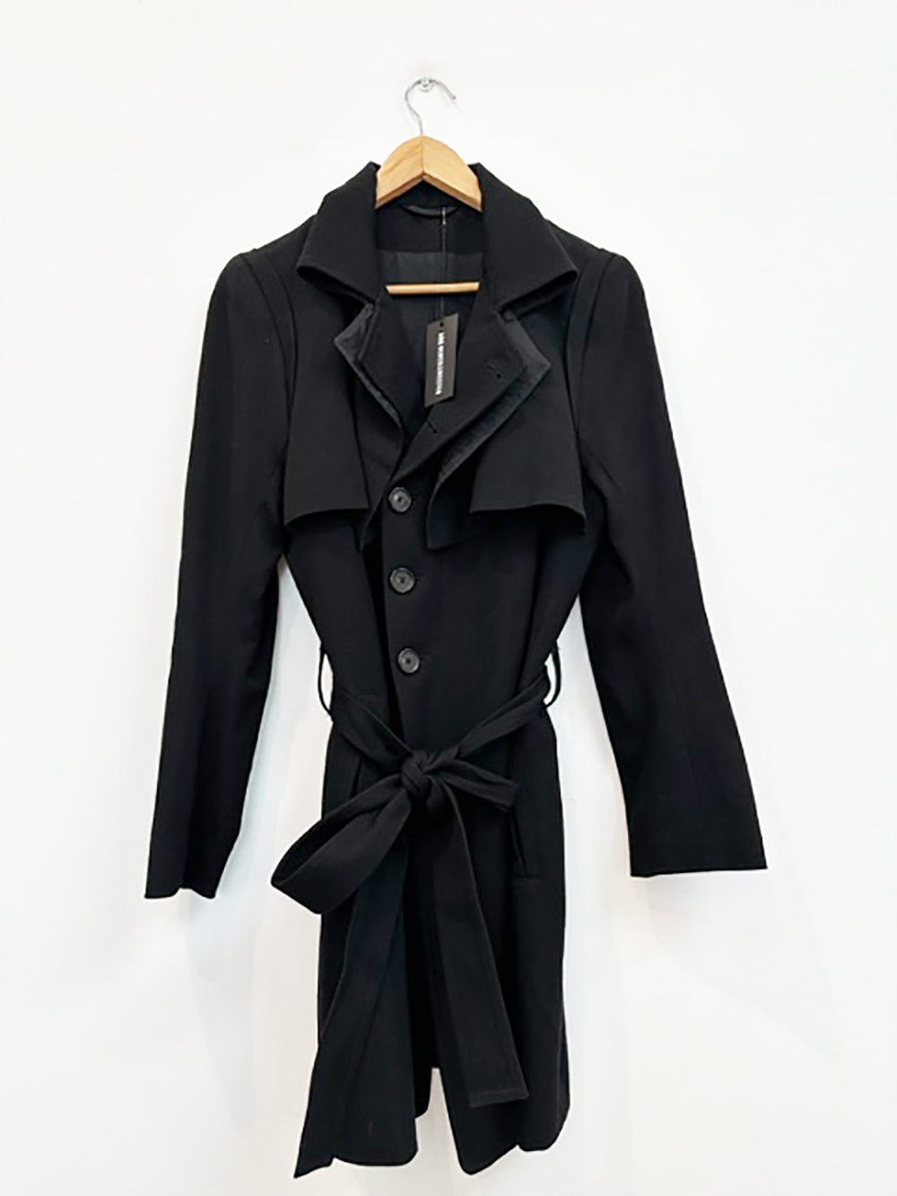 How about this designer piece! A stunning trench style coat from luxury designer label?Ann Demeulemeester. A lovely just past knee length tie waist trench in black. Fully lined. Pockets for your hands! Wool blend with cotton rayon blend lining. Medium weight, perfect for the trans-seasonal and colder weather.