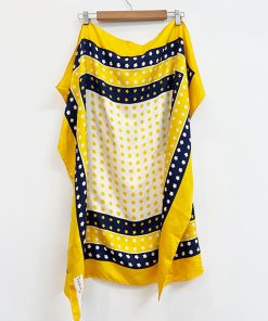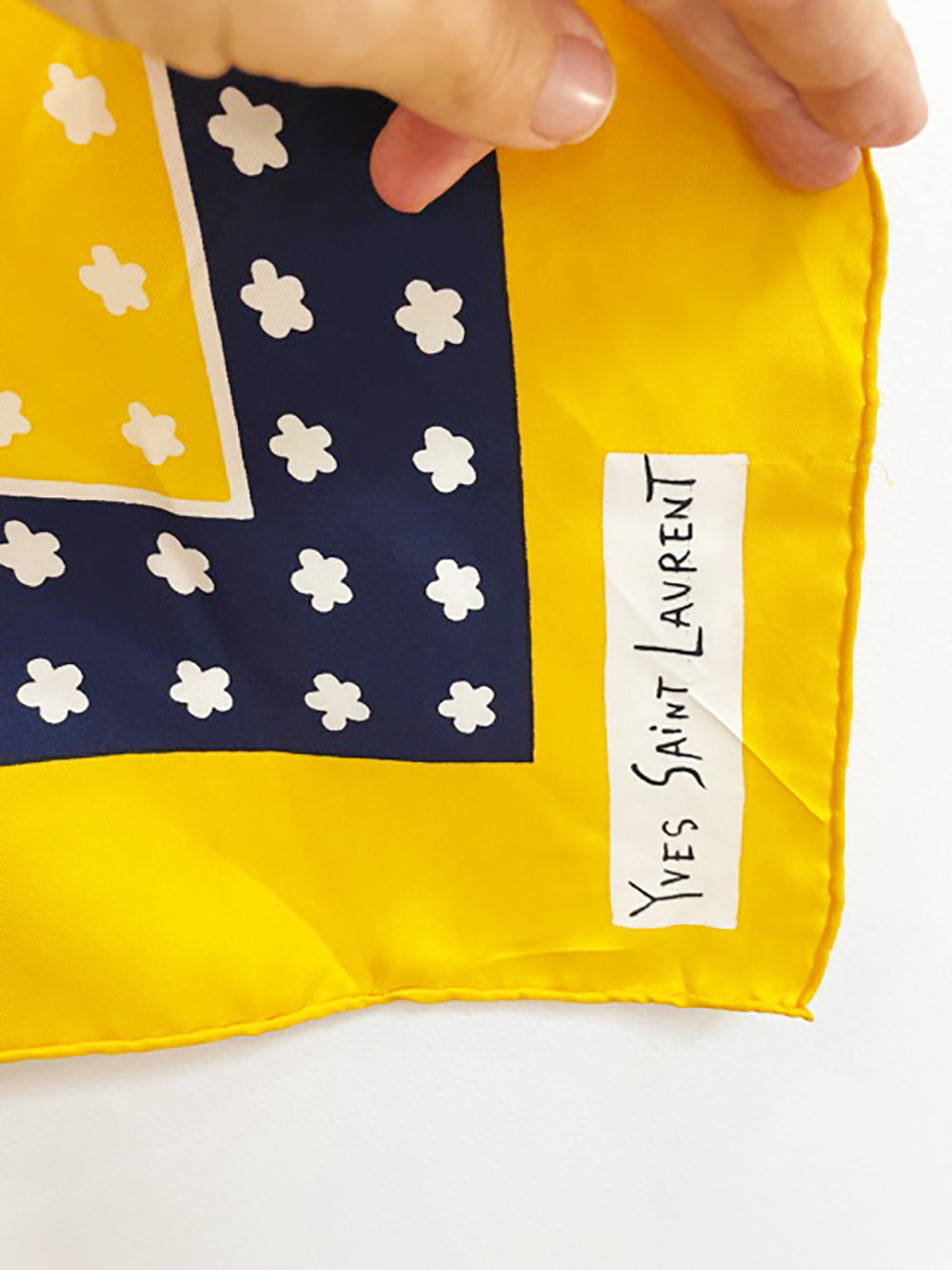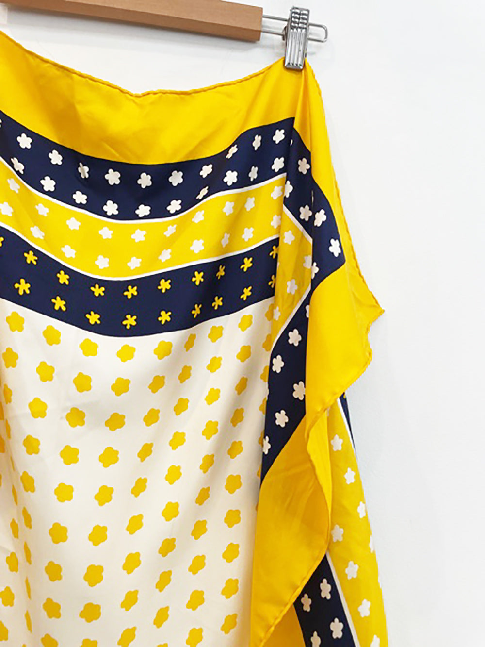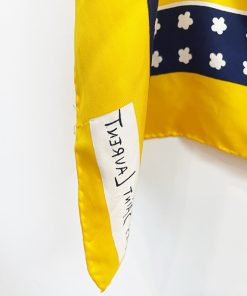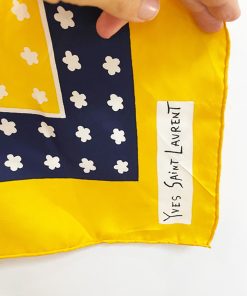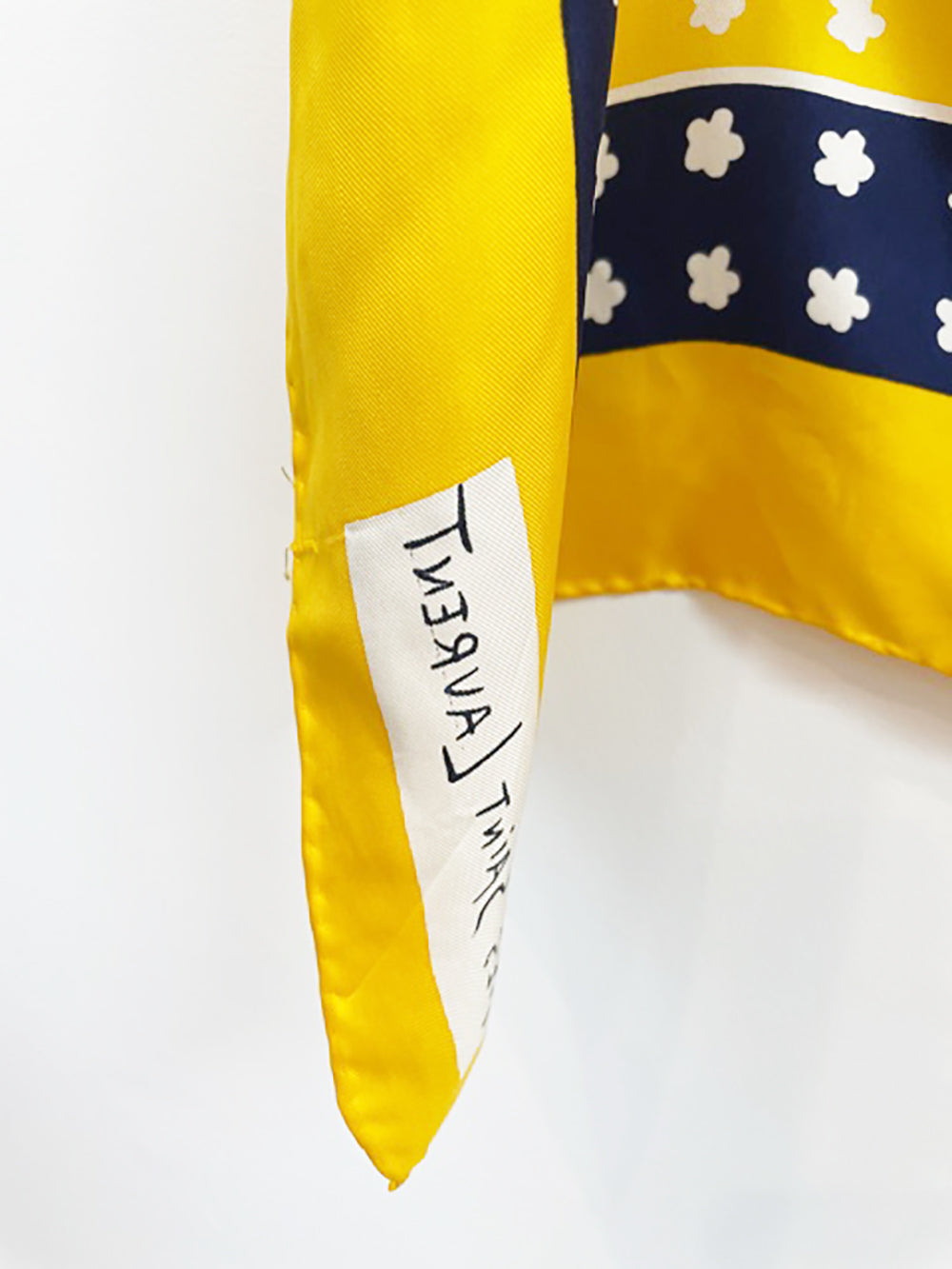 A stunning 1960s rare find! Silk hand rolled edged scarf from Parisian designer label Yves Saint Laurent. Bright yellow and blue geometric and floral design. Large square.? Near new condition, no stains or marks.?