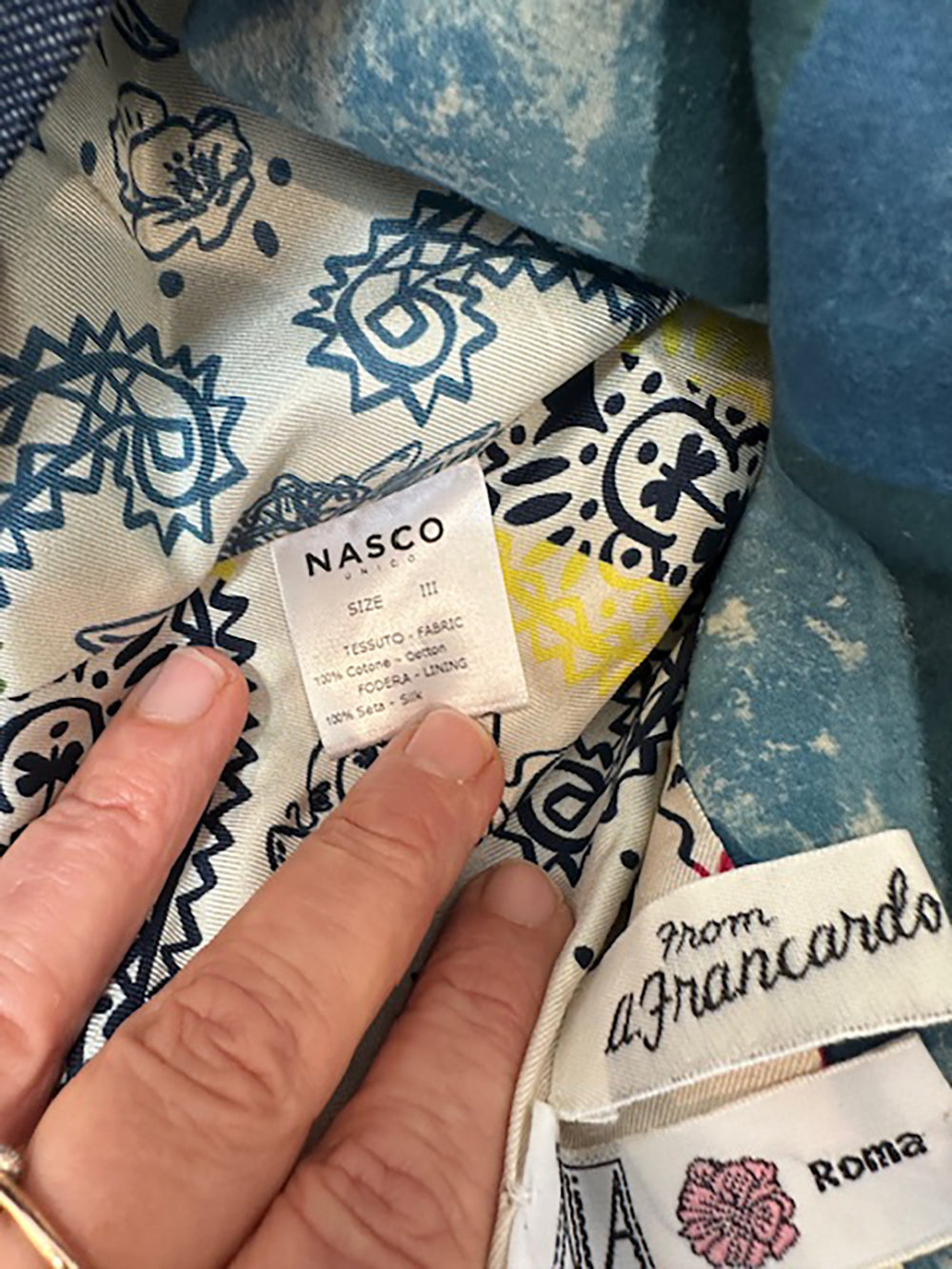 An exquisite one of a kind jacket from luxury Rome Italy label Nasco Unico. Chic pattern and lined in beautiful silk printed fabric. Perfect preloved condition.