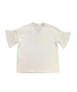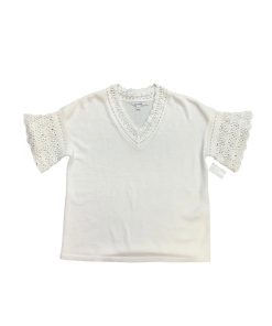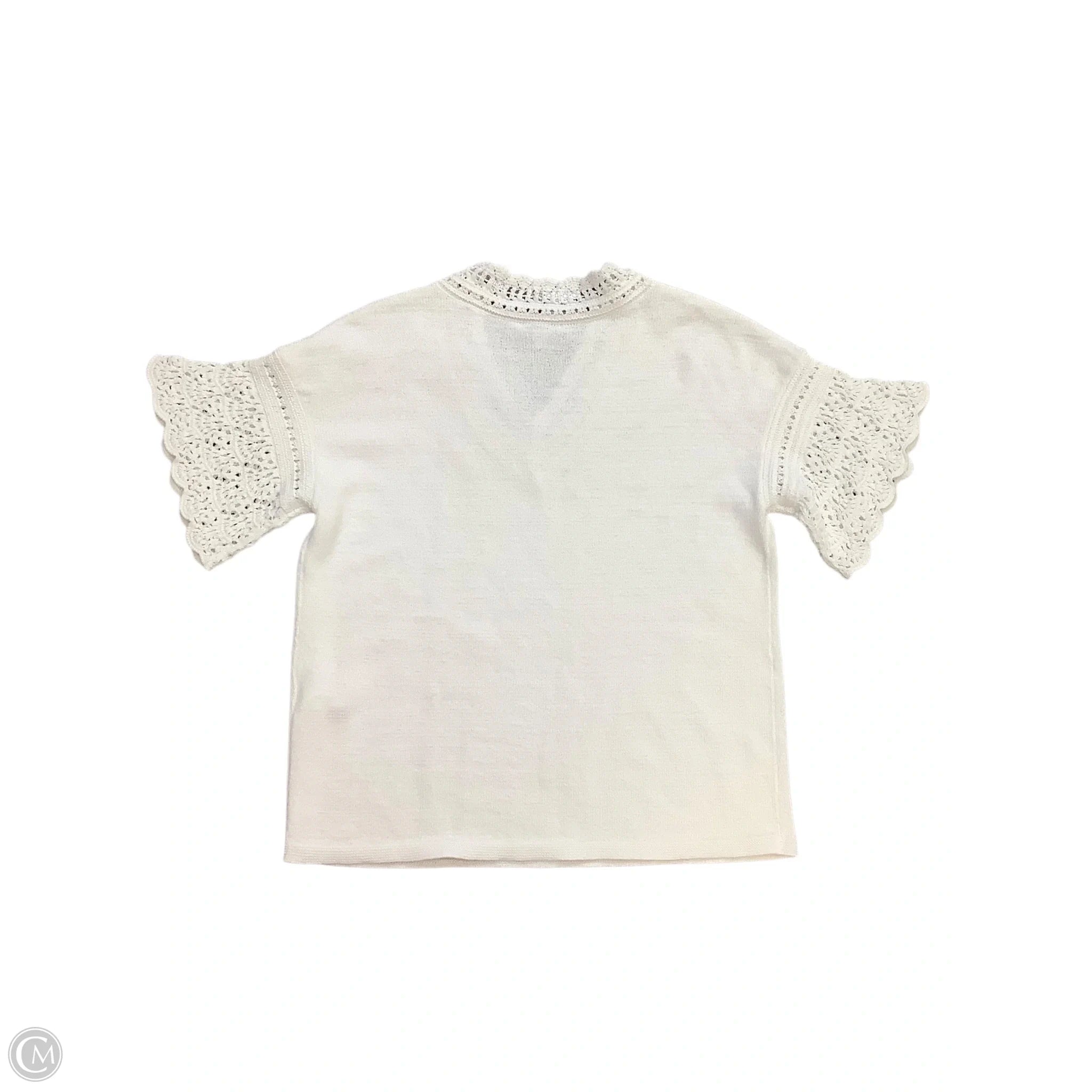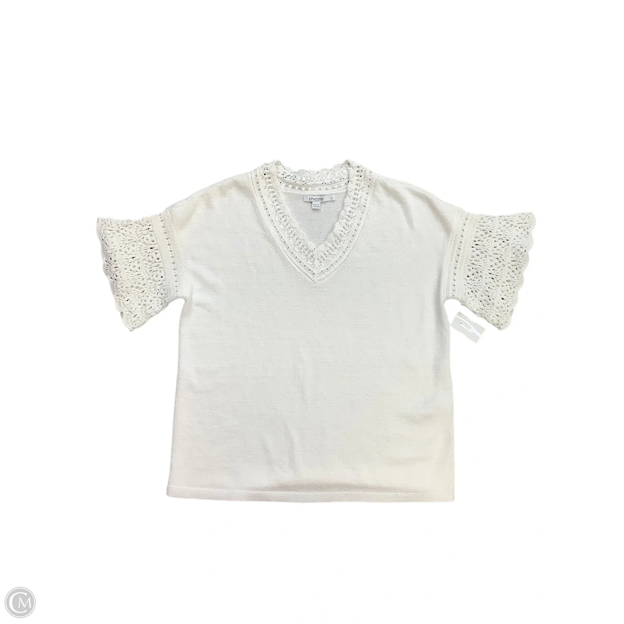 Chico’s white sweater, size M, exudes timeless elegance with its classic short sleeves and chic fit.