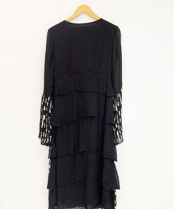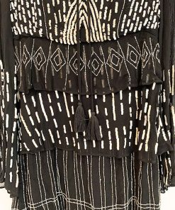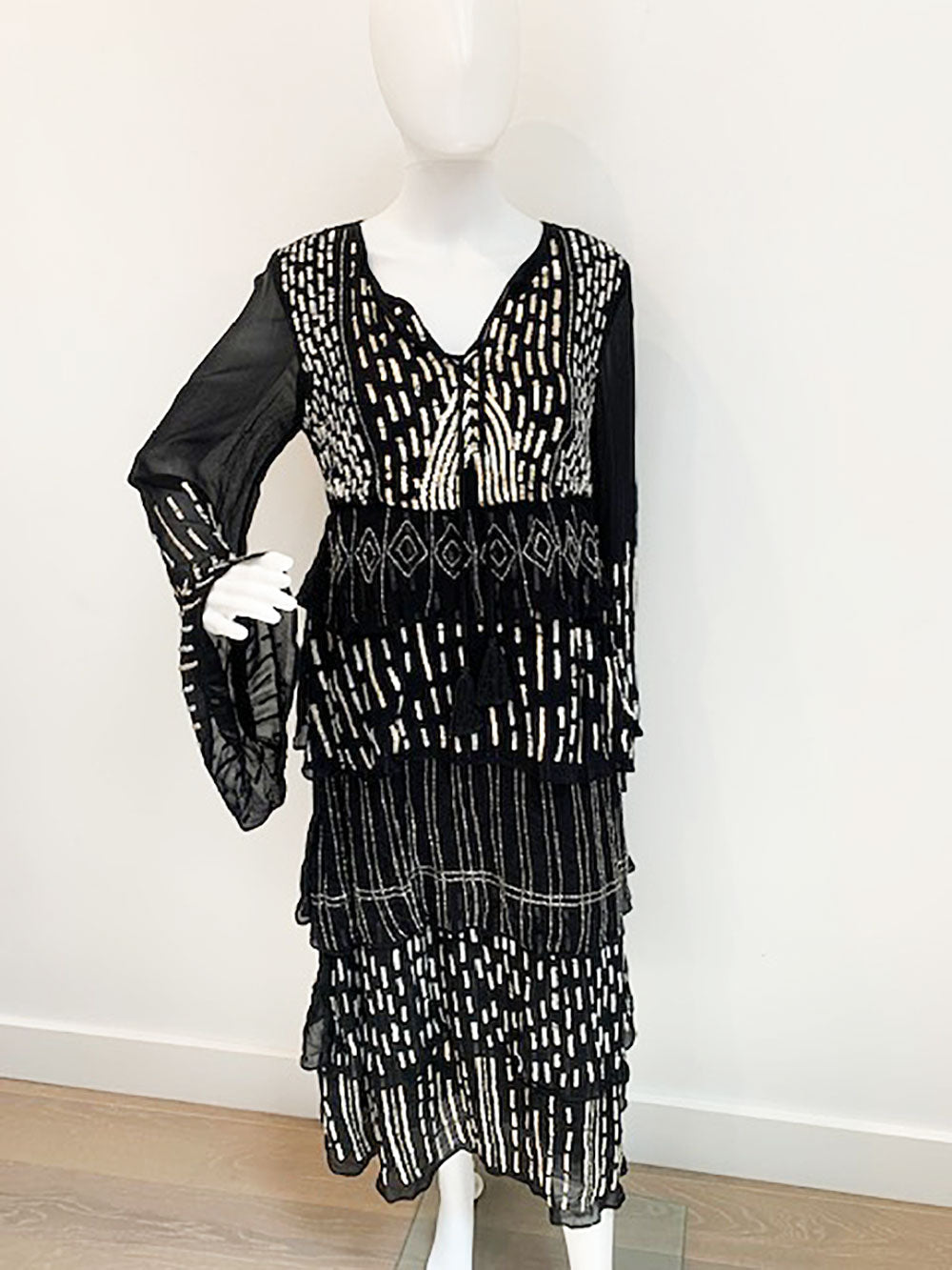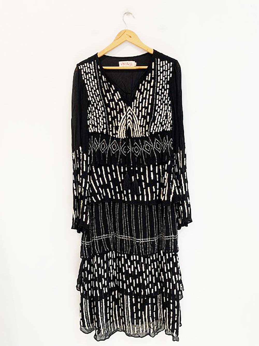 A stunning boho frock from designer label Vintage By Nordic. Such an amazing frock for day to night style! A lovely tiered black midi with amazing beading and sequin detail. Long sleeves and tassel tie detail at neckline! Worn once in perfect preloved condition!