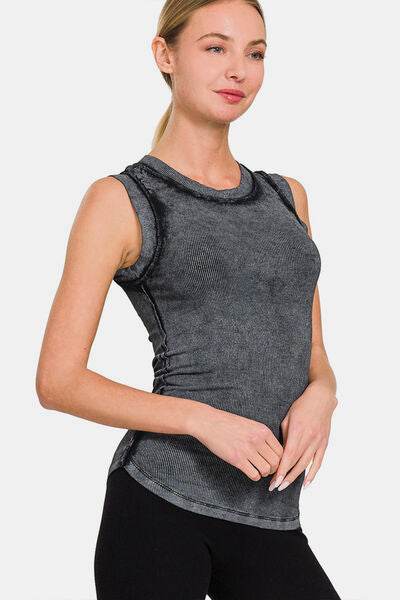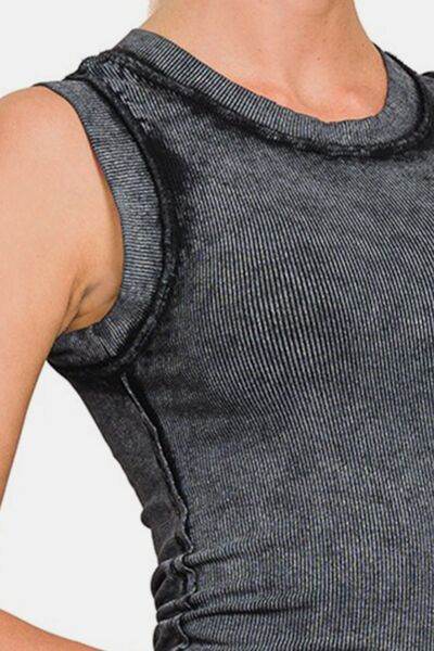 The Washed Ribbed Round Neck Slim Tank is a classic and versatile piece for your wardrobe. Its slim fit and ribbed texture offer a flattering and comfortable wear. The round neck design is timeless and easy to style with various bottoms. The washed finish gives it a soft and relaxed look, perfect for casual everyday wear. This tank top is great for layering or wearing on its own during warmer weather. Add this essential piece to your collection for effortless and chic outfit options.