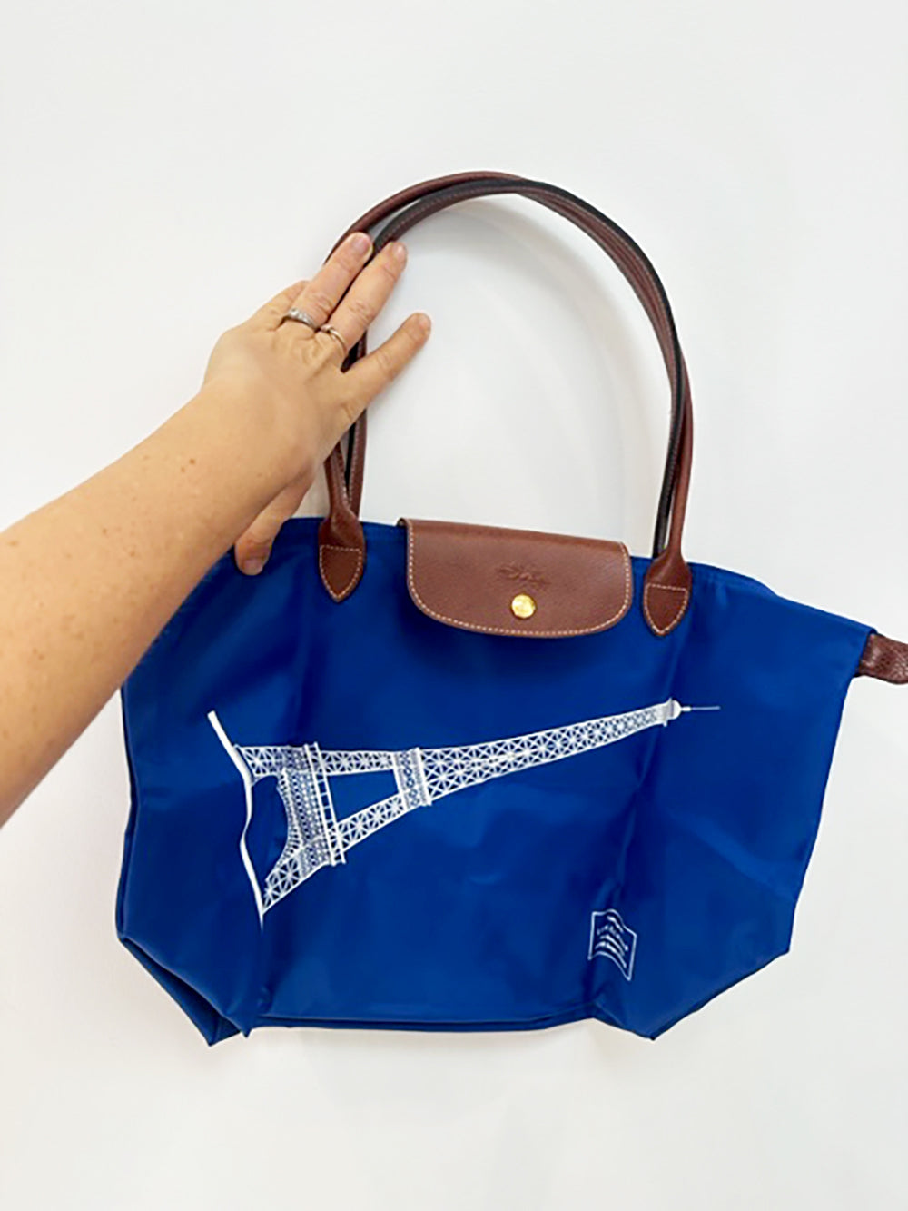 Super cool blue hued Eiffel Tower tote from Longchamp. Leather handles. Used once or twice in perfect condition! Folds up to pack easily on your next trip 🙂